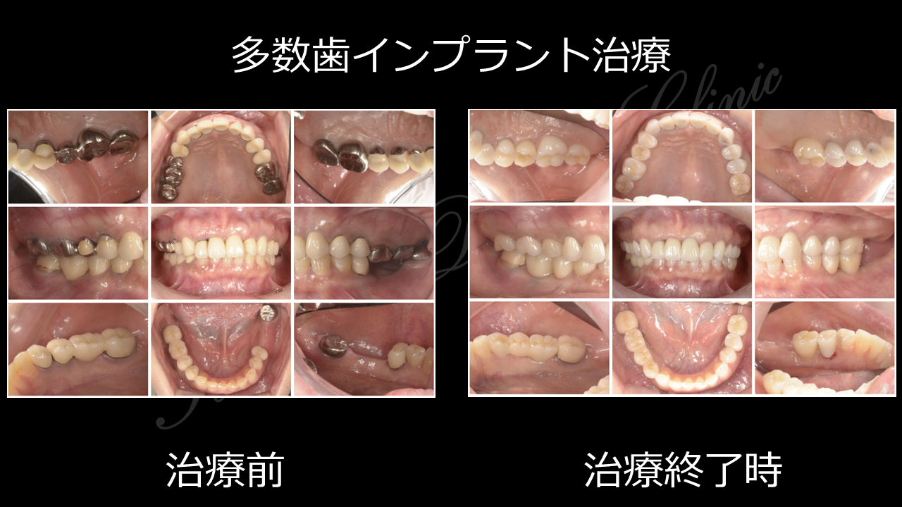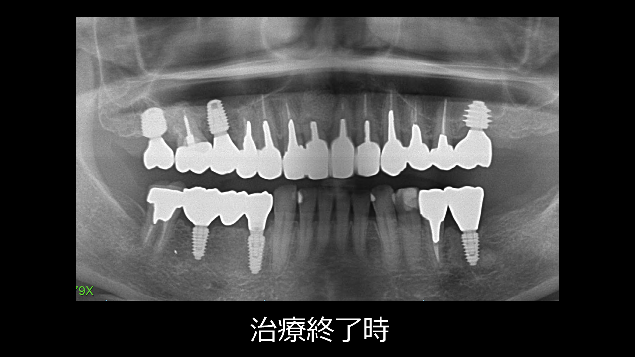 上下左右にインプラントを埋入しました。抜歯即時インプラント埋入や即時荷重(その日のうちに仮歯を入れて噛めるようにする治療)を駆使しています。
