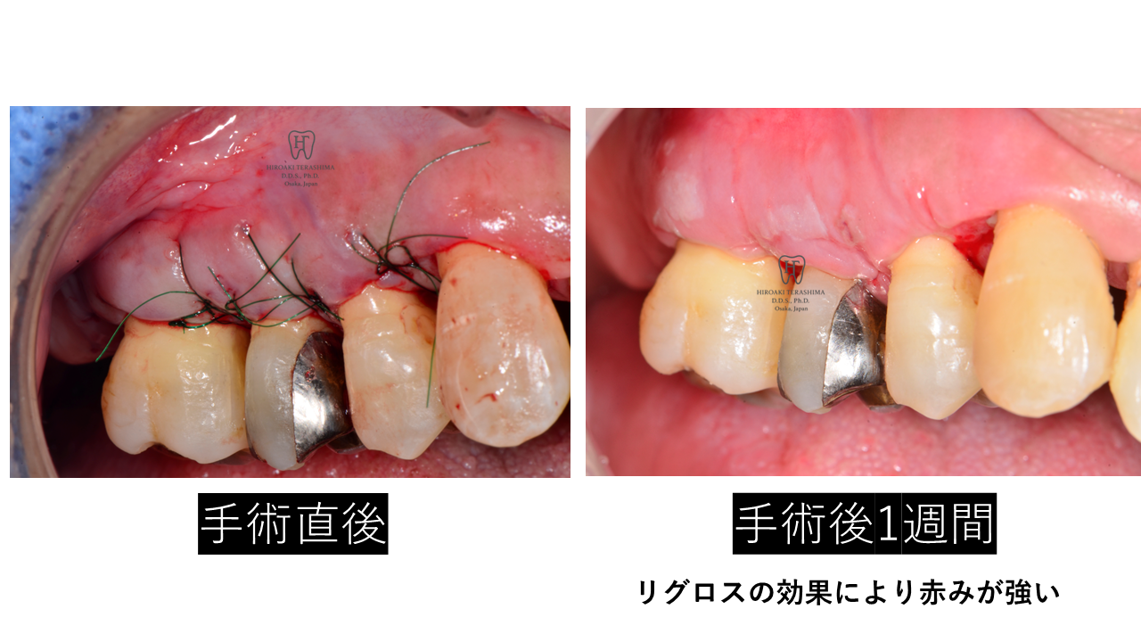 その後、厚生労働省に認可された歯周組織再生薬剤であるリグロスを患部に塗布し、縫合して終了。