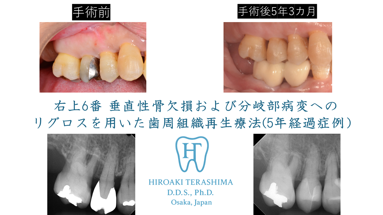 2025/08/27右上6番分岐部病変Ⅱ度に対するリグロスを用いた歯周再生療法 5年経過症例