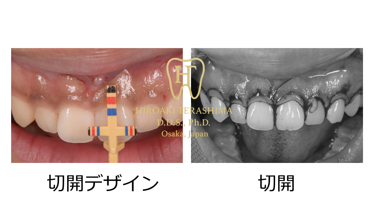 ガミースマイル治療 において重要なのは、正確な切開デザインです。歯冠長を適切に回復させるために、歯肉にマーキングを行い切開しました。