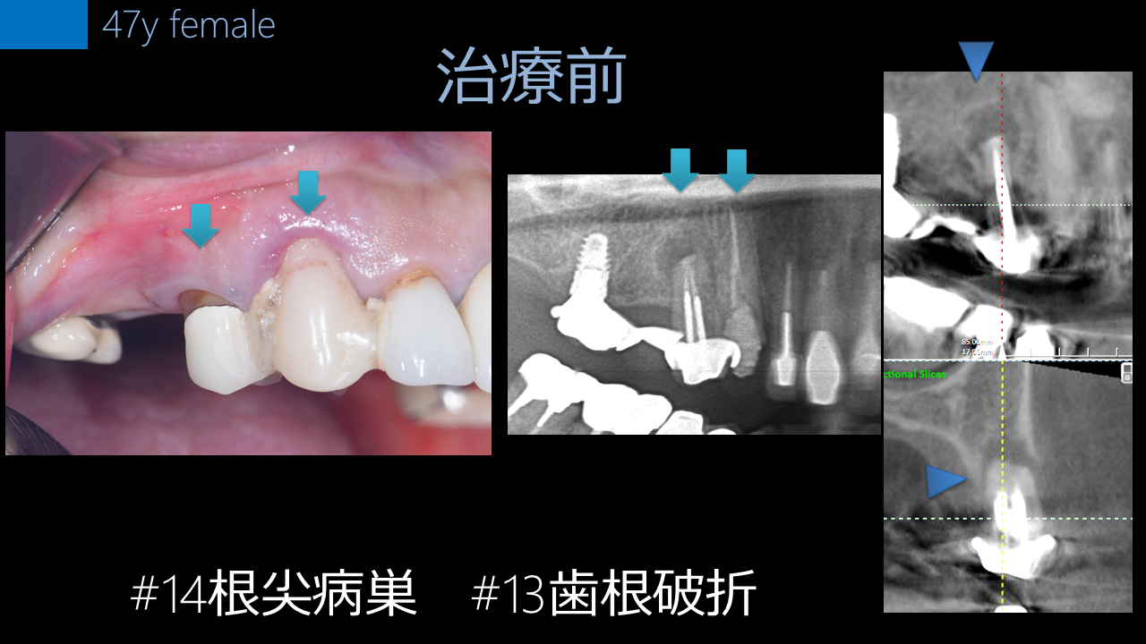 左上犬歯(#13)の歯根破折と、小臼歯(#14)の**根尖病巣(根の先の炎症)**を主訴に来院されました。