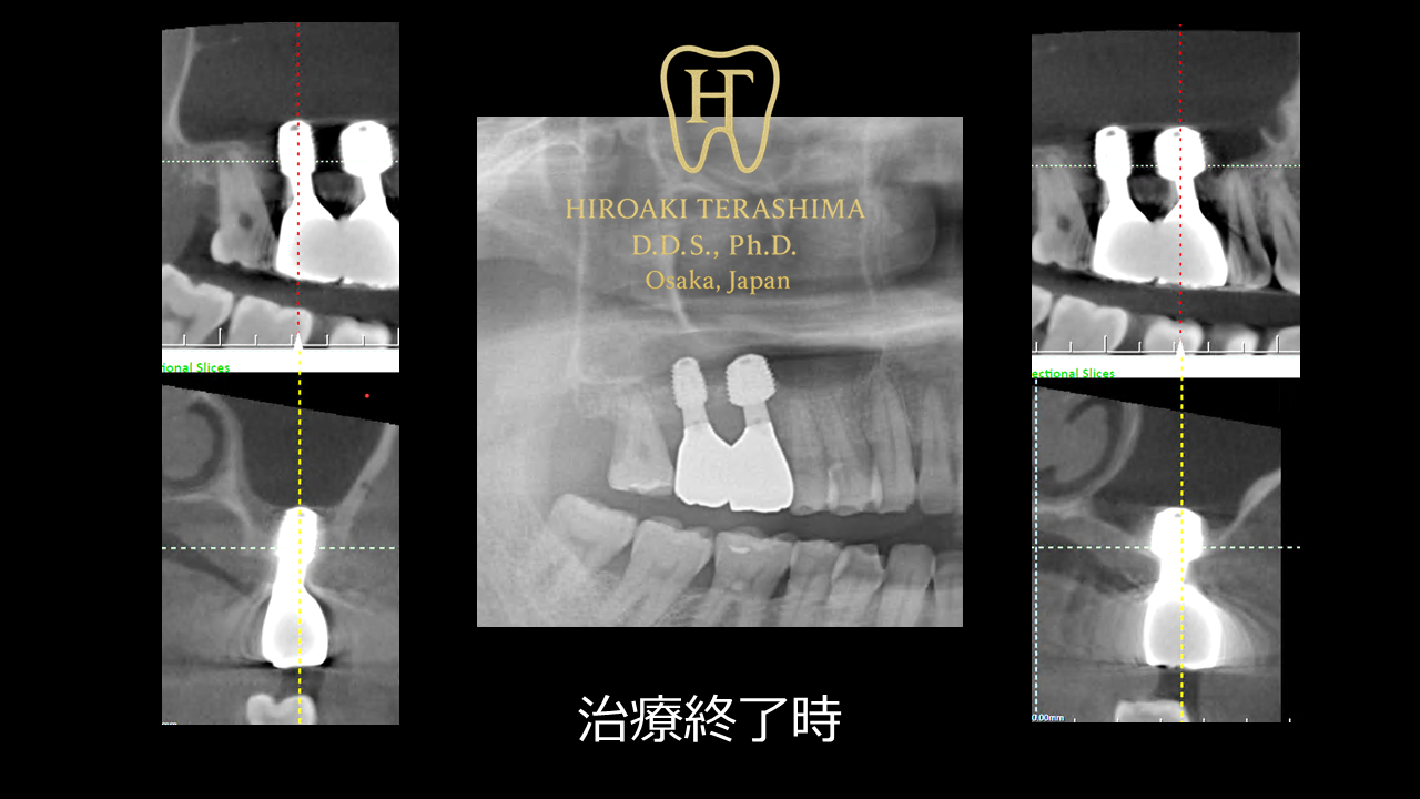 もしインプラント治療で迷っていたり考えている方がいらっしゃるなら、まずご自分の口腔内をくまなく理解しインプラントやそれに付随する全てをご自分で猛勉強して下さい。治療は歯医者さんだけではなく(人任せ)自分も一緒に勉強しておく事が重要と感じました。 今後の治療も踏まえ寺嶋歯科医院に来るのが毎回楽しみです。
